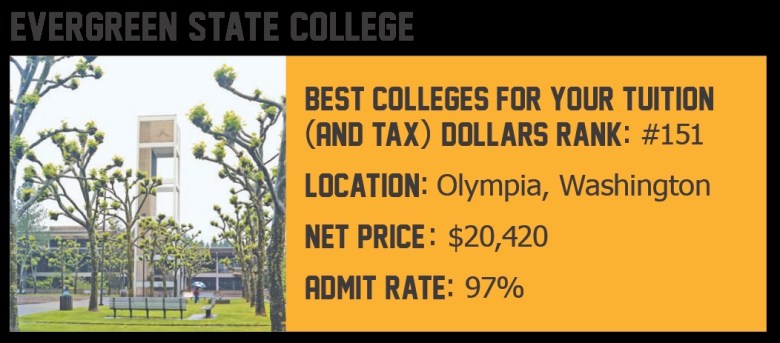 Almost everyone who applies gets in. Of Evergreen’s 2,505 students, a third are on Pell Grants. Though the college has a fairly high net price of $20,420, its graduates leave without a crushing amount of debt. It only gets better from there. Evergreen graduates greatly overperform in earnings, making almost $11,000 more in their early careers than peers with similar educations and socioeconomic backgrounds. Many go on to earn PhDs and to participate in national service programs like AmeriCorps and the Peace Corps.