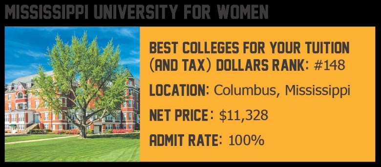 Forty percent of undergraduates are on Pell Grants, a very high proportion of non-wealthy students. The university accepts pretty much everyone who applies, and charges them a reasonably low net price—about $11,000 annually. But its standout accomplishment is the low debt with which its graduates leave: an average of $15,000. That puts the W at 70th in the nation, ahead of venerated names like Northwestern, University of Chicago, and Cal Tech. The W also overperforms in getting its students to graduate on time. Earnings just about meet expectations, and students’ participation in service is middle of the road. Where MUW really excels is getting degrees into the hands of Mississippi’s working and middle classes—on time, at low cost, with little debt.