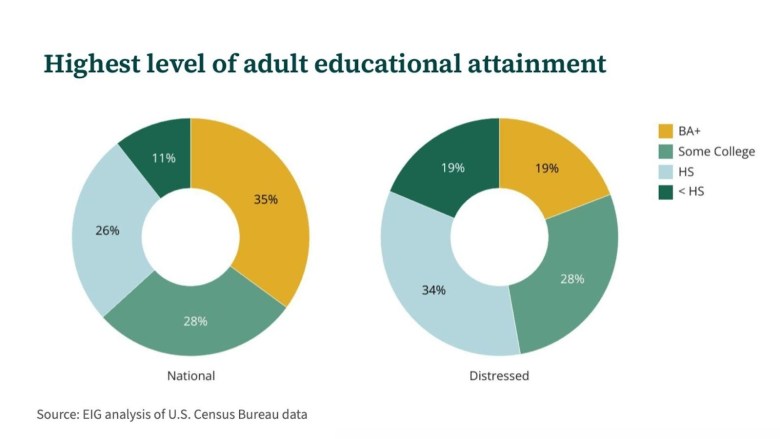 It’s one of the first things that I point to to explain the geography of well-being today. Where college-educated Americans live is the well-off geography, whereas Americans with high school or less live in predominantly distressed geography. And then there are more mixed communities where folks with associates degrees or some college are interspersed with folks from both the high and low ends of the educational attainment spectrum living together. That’s where you’ll get mid-tier communities.