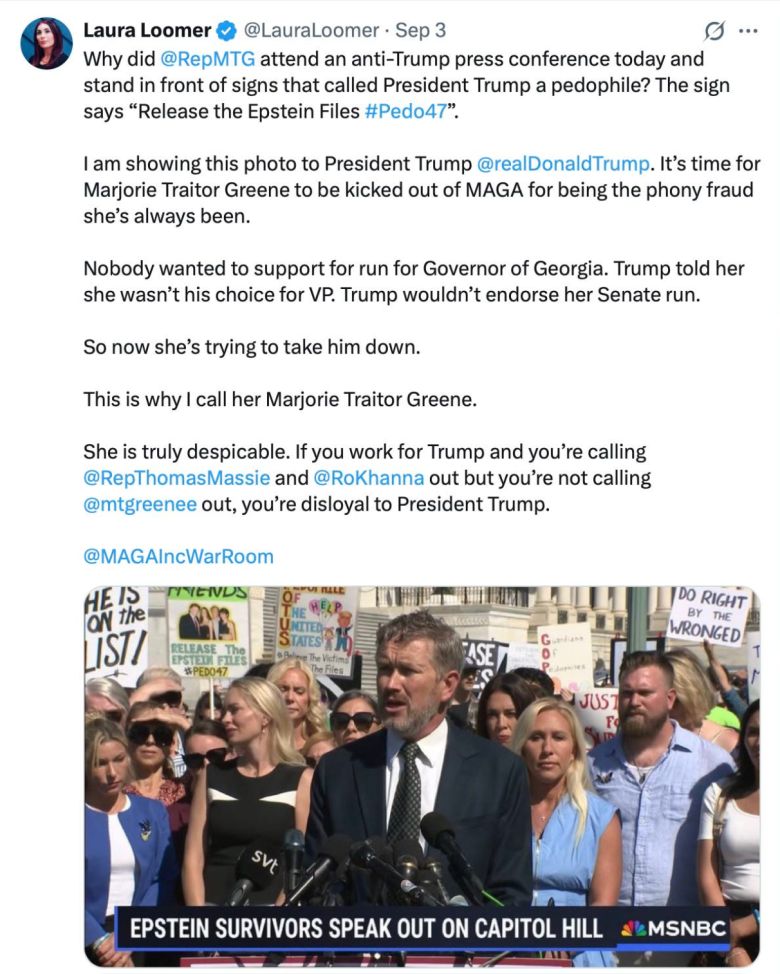 But the politics of the Epstein story remain treacherous for Trump. Instead of the usual partisan lines, the MAGA base is split over it, with nut job Rep. Marjorie Taylor Greene demanding the release of the files and nut job presidential adviser Laura Loomer manning the X barricades for her man: