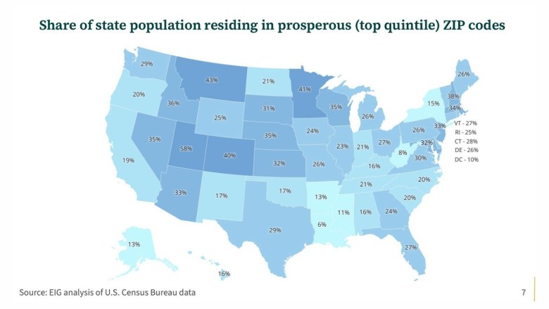 And interestingly, we’re seeing now that in a lot of corners of the Northeast, states like New York, Rhode Island are really starting to fall relative to when we first did the DCI in 2010, when the superstar cities and the really college-educated places were doing best. They had large swaths of their population in prosperous zip codes. Now that’s ebbing, such that New York and Alabama have equivalent shares of their populations living in prosperous zip codes.