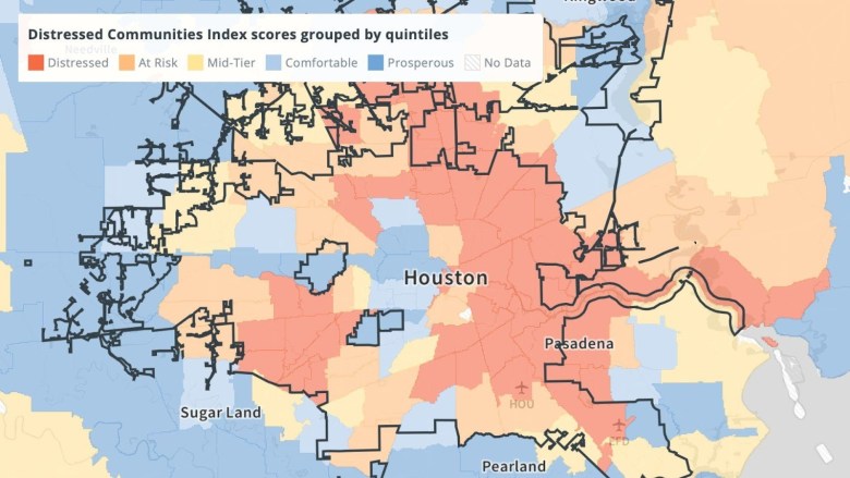 Kenan Fikri: Take Harris County, Texas, for example. It’s one of the most populous in the country, but 1.4 million residents live in a distressed zip code in the same county, while 1.1 million residents are living in a prosperous zip code. And here we’re talking about poverty rates that may be 30 percent or higher in the distressed portion of the community, compared to below 5 percent in some more outlying jurisdictions. You’re going to see huge gaps in educational attainment too. And even in something like vacancy rates where you have a lot of disinvested properties, you may have one in six, one in seven, one in five homes vacant in a distressed corner, even in a growth market such as Houston.