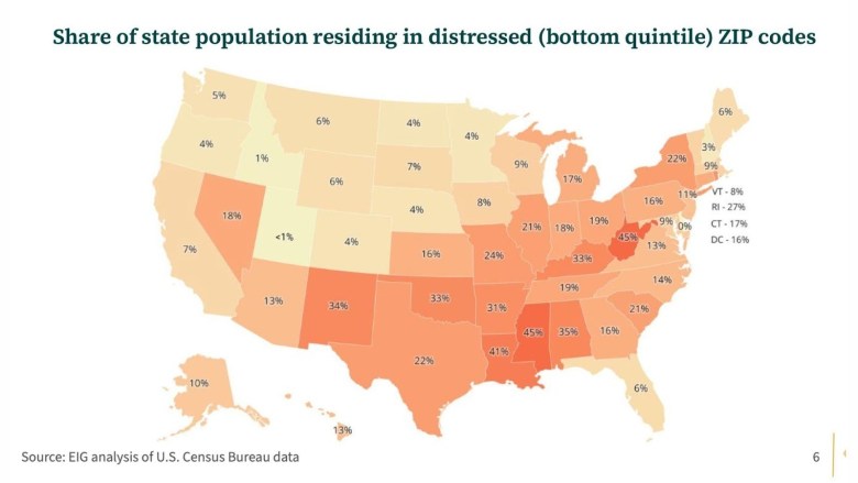 If you’re looking at the U.S. map, looking state by state, we see a concentration of distressed zip codes in the deep south, first and foremost, in states such as Louisiana and Mississippi, but then kind of stretching all the way up across the so-called “Eastern Heartland” into Ohio and Michigan where you’re still seeing above national percentages of state populations living in distressed communities. But really these pockets exist in really almost every major metropolitan area and then across numerous rural areas as well.